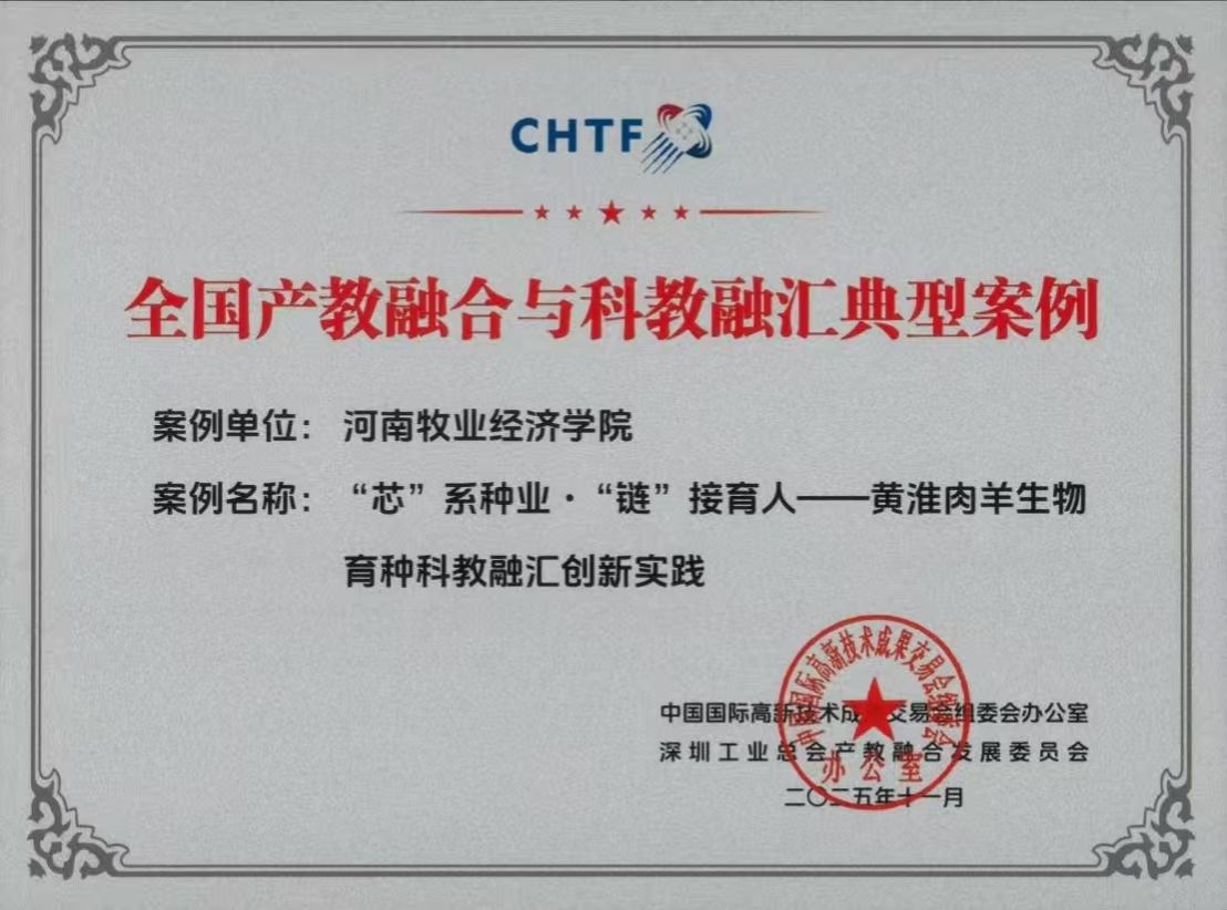 近日,在第二十七届中国国际高新技术成果交易会第二届产教融合与科教融汇论坛上,由我校动物科技学院申报的《“芯”系种业,“链”接育人——黄淮肉羊生物育种科教融汇创新实践》案例,成功入选全国产教融合与科教融汇典型案例。