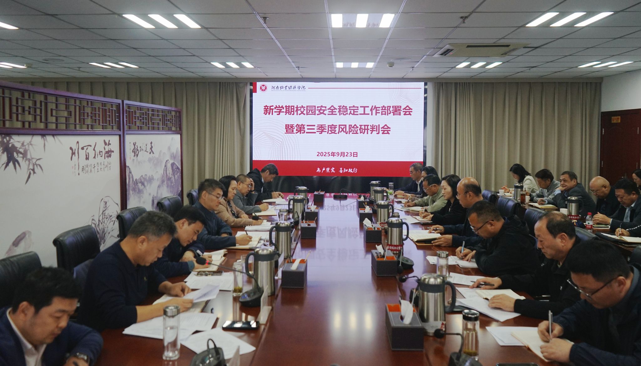 9月23日,学校在龙子湖校区841会议室召开新学期校园安全稳定工作部署会暨第三季度风险研判会。校领导刘志伟、尹新明、姚毅、黄良杰、席磊、岳彩军、韩永刚出席会议。学校安全管理与生产工作领导小组成员单位、相关部门及各学院(部)负责人参加会议。会议由副校长席磊主持。