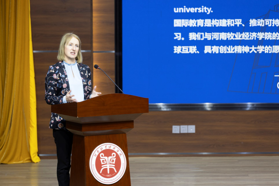 刘宝在致辞中表示,河南省政府外事办公室愿为豫爱教育合作搭建更多平台,促进两国文化互鉴,加深彼此的理解和友谊。她希望同学们在夯实专业知识的基础上积极参加中爱交流活动,学用相长、融贯中外,努力实现本土根基与国际视野的平衡,兼具国际化的眼光和容纳世界的胸怀,展现构建人类命运共同体的青春担当,为推动中爱文明交流发挥积极作用。