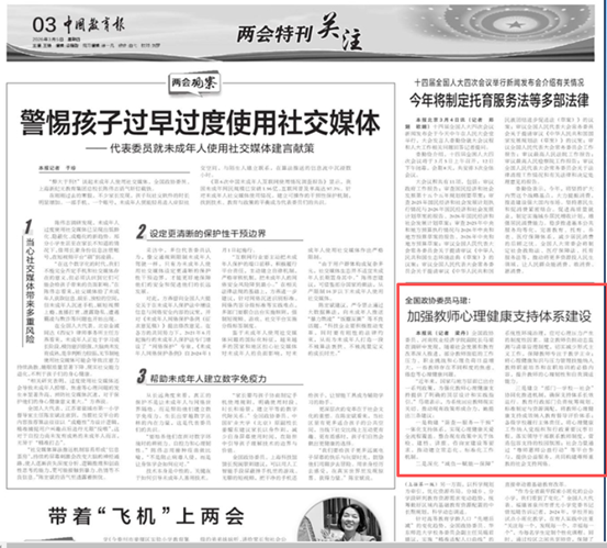 2026年全国两会期间,全国政协委员、副校长马珺聚焦教师心理健康议题,结合前期深入调研所得,提出系列针对性建议,为构建完善的教师心理健康支持体系、筑牢教育高质量发展人才根基贡献智慧和力量。近期《中国教育报》刊发了相关采访内容。