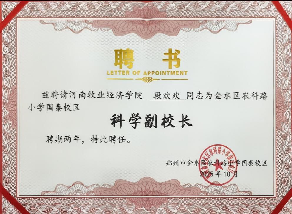 近日,河南省制冷学会科宣部部长、郑州市首批中小学科学顾问专家、我校能源与智能工程学院能源与动力工程专业教师段欢欢受聘担任郑州市农科路小学国泰校区科学副校长。