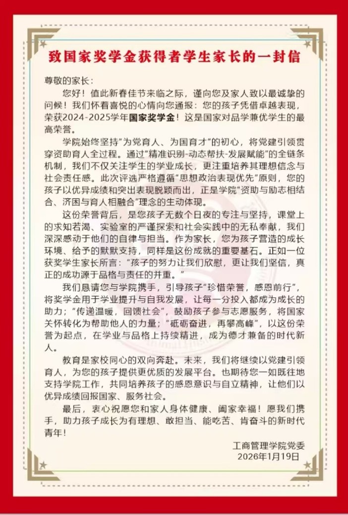 为深入贯彻落实立德树人根本任务,深化育人内涵、切实强化家校协同育人机制,近日,工商管理学院以院党委名义,向荣获2024-2025学年国家奖学金的学生家庭寄送贺信。