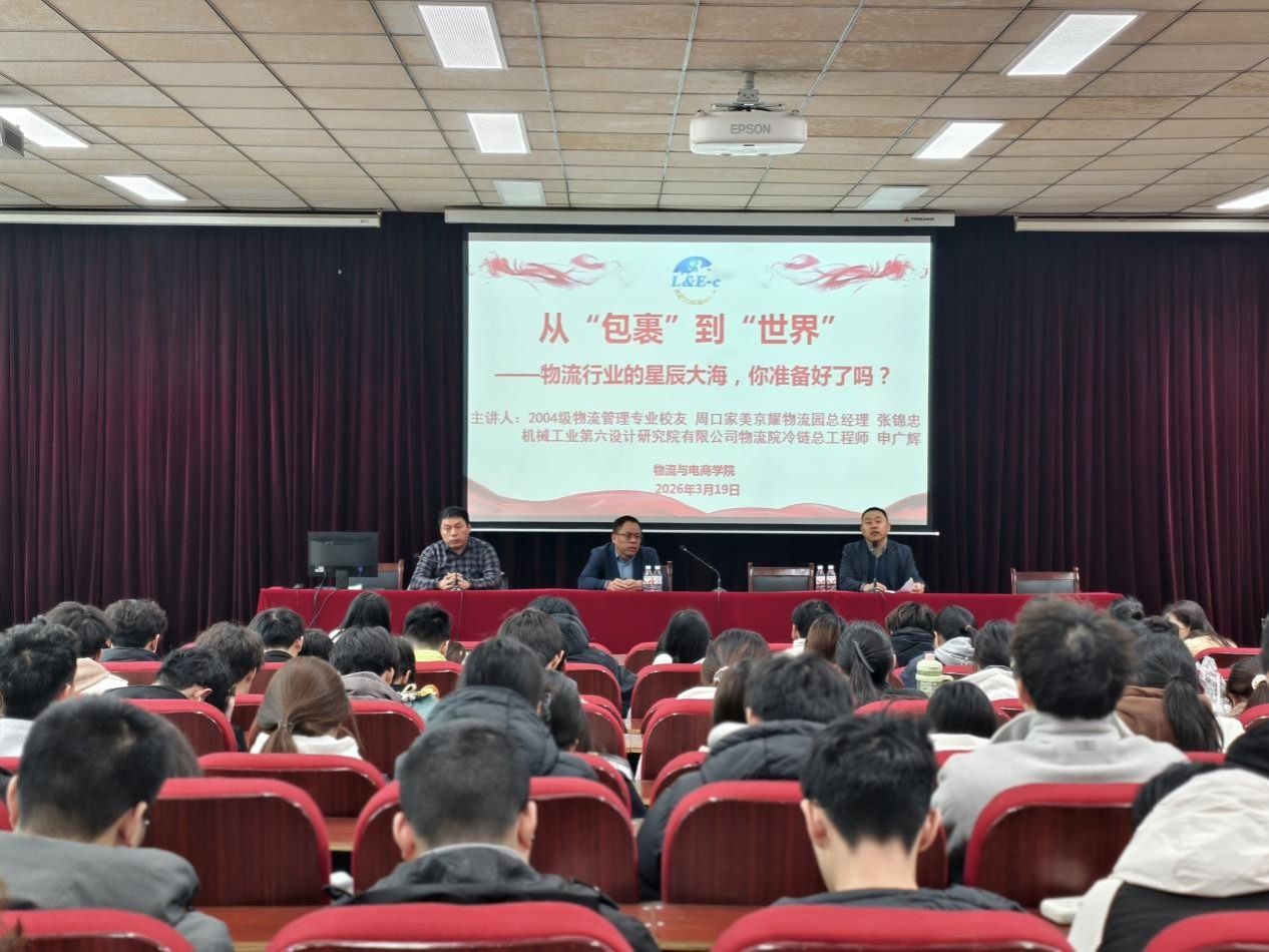 近日,物流与电商学院在E110举办“从‘包裹’到‘世界’——物流行业的星辰大海”专业教育讲座。本次讲座特邀物流与电商学院2004级校友、周口家美京耀物流园总经理张锦忠及机械工业第六设计研究院有限公司冷链总工程师申广辉担任主讲嘉宾。物流与电商学院副院长李金峰出席讲座并主持活动。全体物流专业教师及部分学生代表参加讲座。